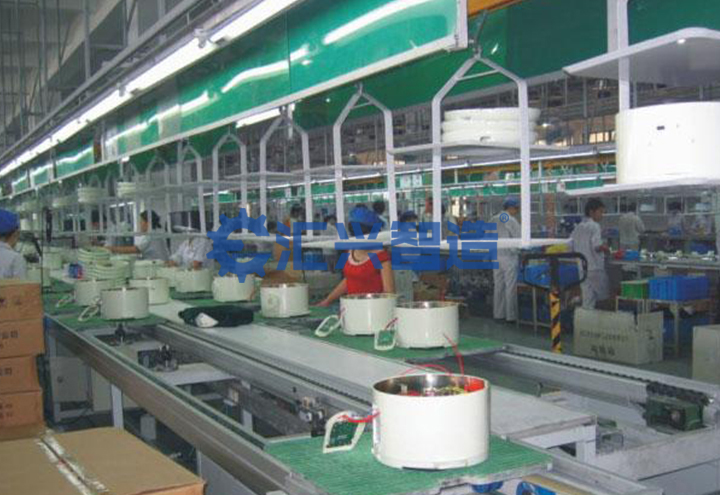 匯興智造電飯煲整廠自動化生產線是由各式差速鏈裝配檢測線、懸掛輸送裝配線、輥道輸送裝配線、鏈板式電機浸漆線、電飯煲測試檢測線組成,另外包括自動噴涂設備、頂升平移機、打包機等各類專機設備,共同完成電飯煲的生產任務。