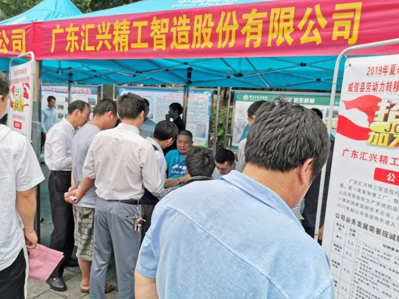 由威信縣委、縣政府,東莞市大嶺山鎮(zhèn)黨委、政府主辦,威信縣人社局、東莞市大嶺山鎮(zhèn)人社分局承辦的“2019年夏季東莞市大嶺山鎮(zhèn)對(duì)口幫扶威信縣農(nóng)村勞動(dòng)力轉(zhuǎn)移就業(yè)專場(chǎng)招聘會(huì)”在云南威信縣體育館廣場(chǎng)隆重舉行。此次招聘會(huì)有來自廣東省大嶺山鎮(zhèn)的名優(yōu)企業(yè)10余家,大嶺山鎮(zhèn)提供就業(yè)崗位500余個(gè)。招聘會(huì)現(xiàn)場(chǎng)氣氛熱烈,其中匯興智造集團(tuán)招聘位置前排成長(zhǎng)長(zhǎng)的隊(duì)伍,應(yīng)聘者禮貌有序地排隊(duì)填寫應(yīng)聘表。