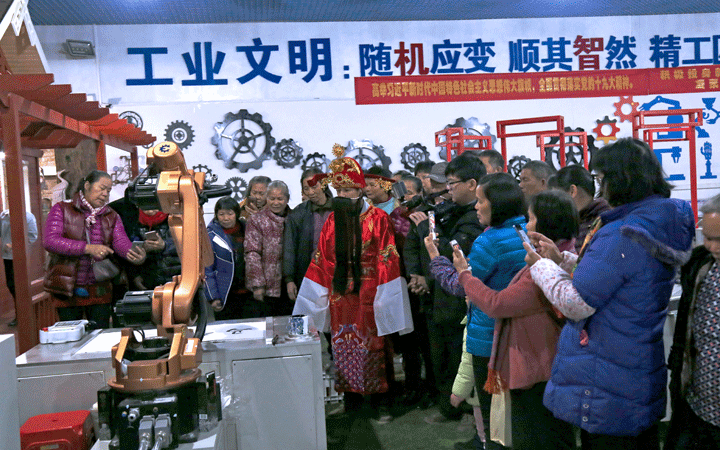 活動現場,匯興智造黨支部、工會委員會、團工委等工作人員裝扮成財神為老人送上新年利是,陪伴老人一同參觀匯興智造工業4.0智能裝備體驗館,體驗智能制造“隨機應變”“順其智然”改變傳統生產的魅力;觀看由匯興智造員工自編自演的京劇舞蹈廠歌等文藝節目,感受匯興智造“用情做人、用心做事”,“敬天愛人,孝道為先”的文化力量。