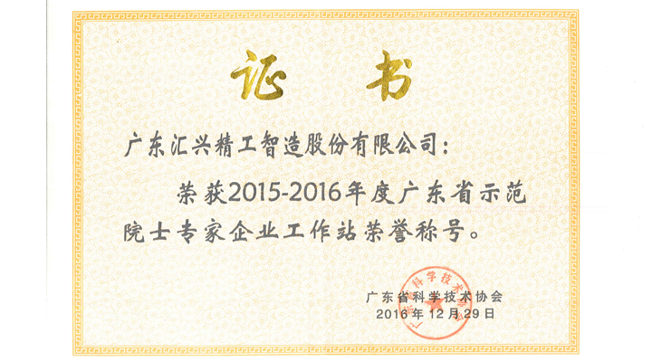 匯興智造廣東省示范院士專家企業(yè)工作站榮譽(yù)證書