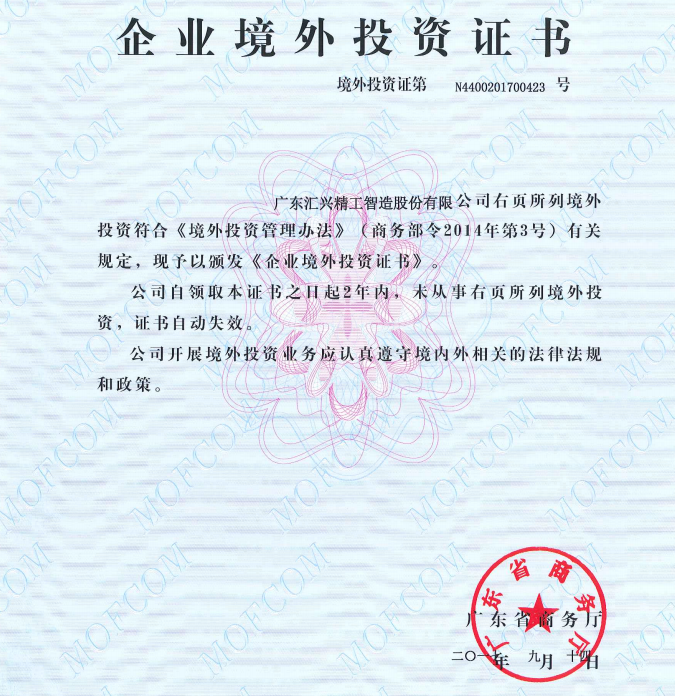 2017年8月29日,廣東匯興精工智造股份有限公司(股票代碼:839258)正式獲得企業(yè)對(duì)外投資證書。匯興智造赴德設(shè)立全資子公司,是響應(yīng)國家‘一帶一路’這個(gè)偉大重要的戰(zhàn)略,從而實(shí)現(xiàn)公司可持續(xù)發(fā)展。“一帶一路”戰(zhàn)略的實(shí)施,為我們民營企業(yè)“走出去”創(chuàng)造出了難得的歷史機(jī)遇。新的機(jī)遇,既要看天氣,更要接地氣,推動(dòng)企業(yè)國際化,從來不是紙上談兵,而是爭取如何落到實(shí)處。