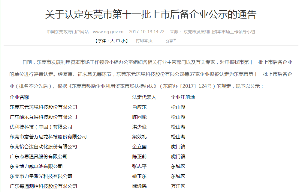 關于認定東莞市第十一批上市后備企業(yè)公示的通告