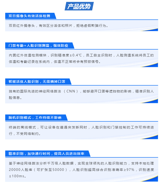 用國際先進的神經網絡算法 (CNN), 是經數千萬次的算法訓練后形成的產品,其集圖像采集、人臉檢測、人臉跟蹤和人臉比對等功能,不僅識別率高,同時識別速度快。值得一提的是,這款設備可以輕松識別出戴口罩的人臉信息,非常適合作為此次疫情防控的有力工具。